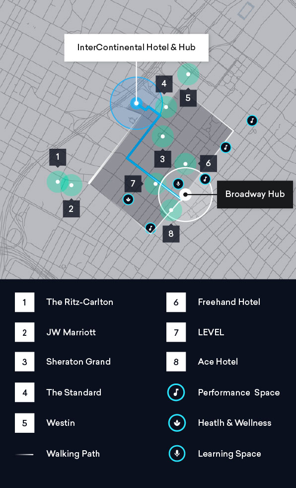 Broadway comes alive with musical performances at the Orpheum Theatre, and encompasses an outdoor attendee lounge, market place and food bazaar, art galleries, immersive wellness spaces, and late night popups woven throughout Broadway’s storefront.